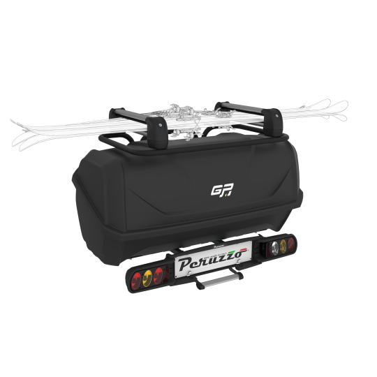 Deze trekhaakkoffer kan ook uitgebreid worden met een Perzzuo ski en snowboard houder.