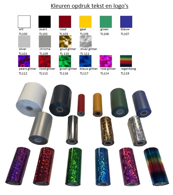 In bijgevoegde afbeeldingen vind je alle mogelijke kleuren van opdruk + de soorten logo's, emoji's en leestekens die we kunnen persen.