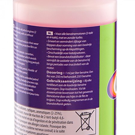 De inhoud van de fles (250 ml) is voldoende om 250 l loodvrije benzine te behandelen.
